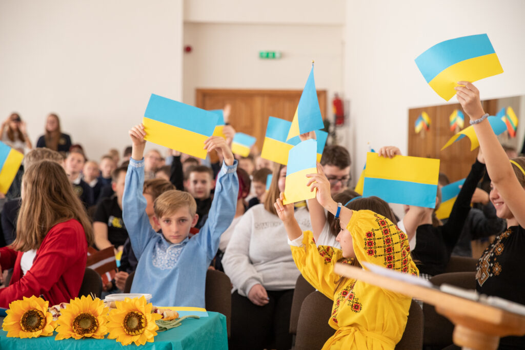 LT: Nuotraukoje Lietuvos valstybės atkūrimo dienos minėjimas Kauno Bernardo Brazdžionio mokykloje. Lietuviai iškėlė savo ir Ukrainos vėliavas kartu. Vaikai ir mokyklos vadovybė nuo pirmųjų dienų ištikimai palaiko Ukrainą.