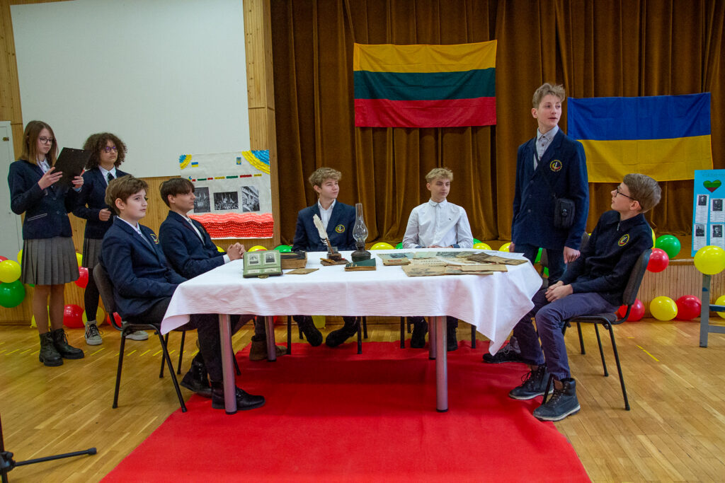 ENG: The photo shows the celebration of the Day of the Restoration of the Lithuanian State (February 16, 1918) (Vasario 16-osios, Lietuvos valstybės atkūrimo dienos, minėjimas) at the Kauno Bernardo Brazdžionio Mokykla school. Along with their flag, the Lithuanians placed our Ukrainian flag. The children and the school management have been loyal to Ukraine since the very first days.