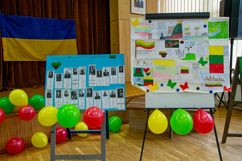 UA: На фото святкування Дня відновлення Литовської держави (16.02.1918р.) (Vasario 16-osios, Lietuvos valstybės atkūrimo dienos, minėjimas) в школі Kauno Bernardo Brazdžionio Mokykla. Разом зі своїм прапором литовці розмістили й наш, український. Діти і керівництво школи з перших днів віддано підтримують Україну.