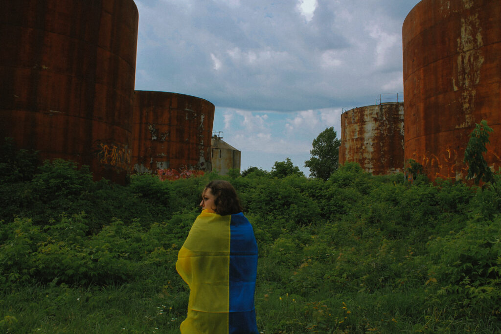 ENG: The photo is of Sofia, she is from Mariupol, just like me. Now all Mariupol residents are people who’s got terrible experience. But here Sofia is standing among the abandoned tanks previously used to store oil and gasoline from Russia. Now these are the ruins of Russia’s former wealth, rusty iron overgrown with grass.