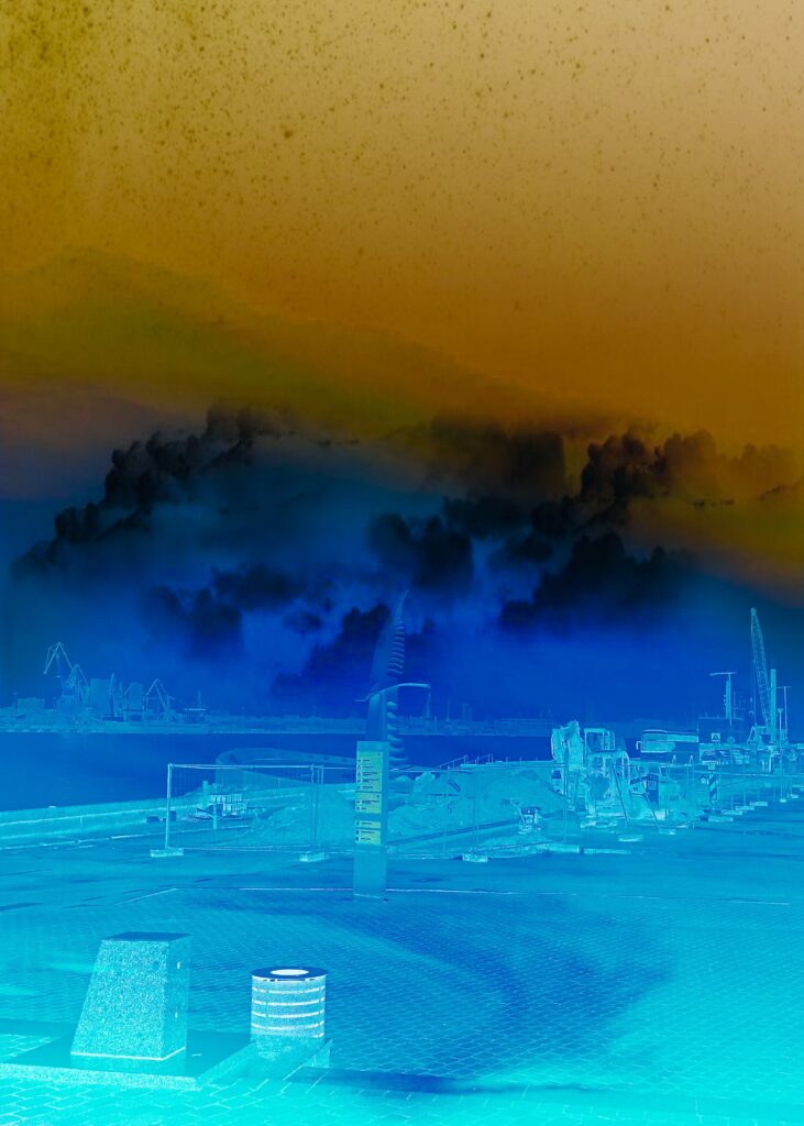 ENG: Here you are, sitting by the dolphinarium in Klaipeda, thinking about the life of the port, about free spaces, looking at dolphins, peaceful locations and a peaceful sky. Suddenly you get a text message from Azovstal, and you are transported to another world. Your peaceful sky is immediately covered with clouds, you see fire, Azovstal is burning, and you see a completely different port and a completely different location. You hear fire and see steel melting….