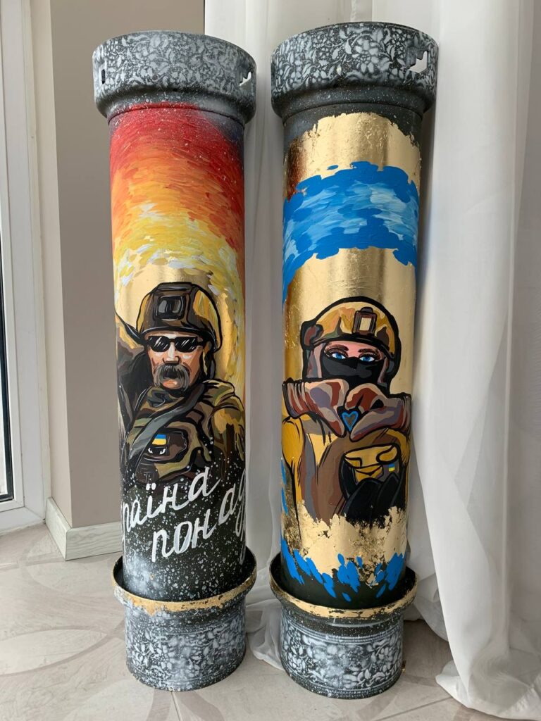 Художниця Марія Юдіна родом із Бердянська Запорізької області. Їй 24 роки, два з яких живе у Києві через війну. Тепер дівчина розмальовує для аукціонів тубуси, снаряди, гільзи та уламки від ракет — квітами. Із початком широкомасштабного вторгнення 90% діяльності Марії займає благодійність.